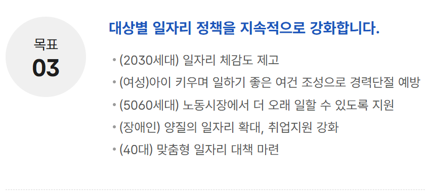 예를 들어, 청년 일자리 창출을 위한 '청년 고용 촉진 프로그램'이 있으며, 이는 청년들이 안정적으로 취업할 수 있도록 지원하는 프로그램입니다.