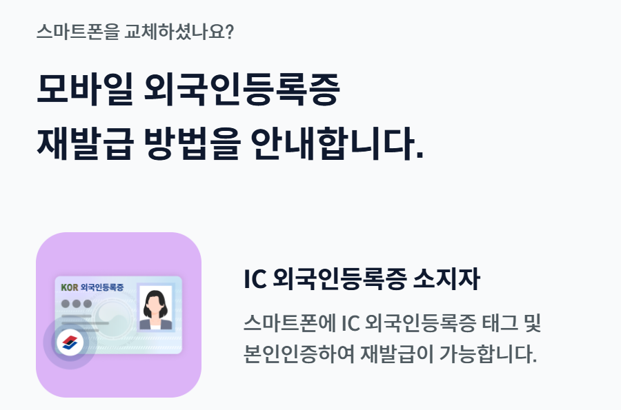 즉, 기존의 외국인등록증이 IC 카드 형태가 아니라면 모바일 등록증을 발급받기 전에 IC 칩이 포함된 신규 외국인등록증으로 교체해야 합니다.