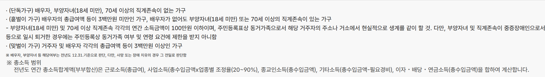 예를 들어 단독가구의 경우 총소득이 일정 기준 이하이어야 하며, 이는 근로·사업·종교인 소득을 합산한 연간 금액을 기준으로 합니다. 홑벌이와 맞벌이 가구 역시 기준 금액이 다르게 설정되어 있으므로 정확한 연소득을 확인하는 것이 중요합니다.