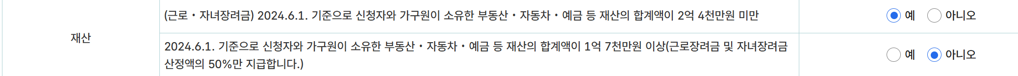 재산 요건도 있습니다. 가구원이 보유한 부동산, 차량, 금융자산 등을 합산한 총 재산이 일정 금액을 초과하지 않아야 합니다. 여기에는 전세보증금도 포함되며, 보유 재산이 기준보다 많을 경우 신청이 불가합니다.