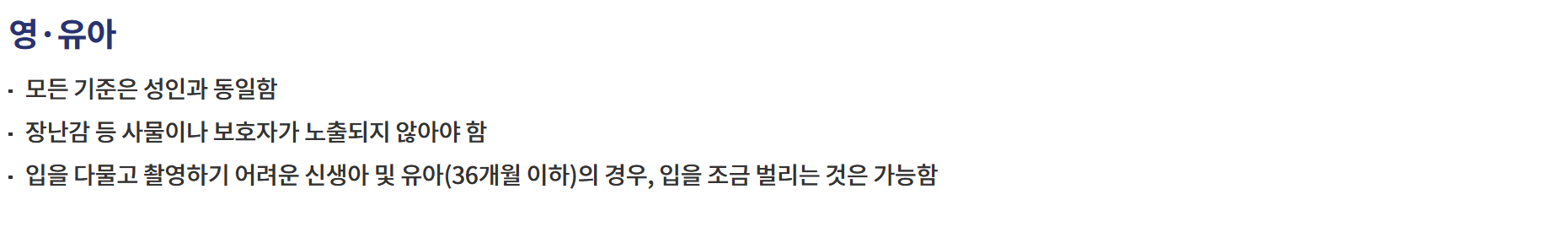영유아의 경우에도 기본적인 규정은 성인과 동일하게 적용됩니다. 단, 신생아 및 36개월 이하의 유아는 입을 약간 벌린 사진도 허용됩니다.
