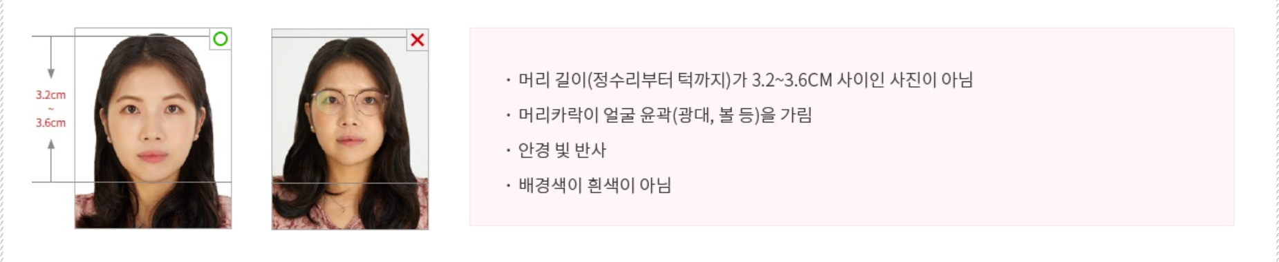 사진의 크기는 오프라인 신청용의 경우 가로 3.5cm X 세로 4.5cm로, 머리 길이는 정수리부터 턱까지 3.2~3.6cm 사이여야 합니다.